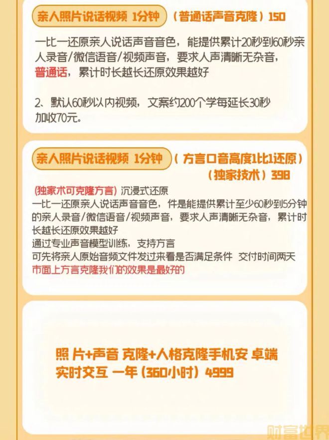 三是,照片生成动态视频、声音克隆(可方言)。需提供若干照片、视频、音频等素材,还原人物音色。不同店铺产品时长、价格不尽相同,市场价格在100~1000元左右;