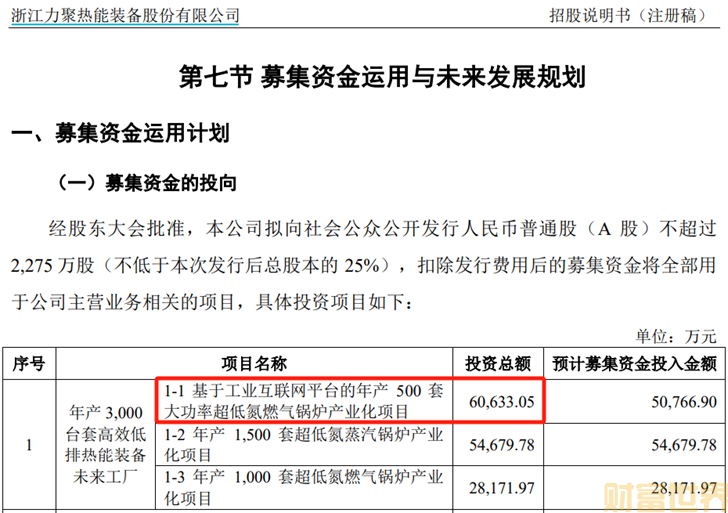 以主体募投项目“年产3000台套高效低排热能装备未来工厂”为例,其中包括第一个子项目就是“基于工业互联网平台的年产500套大功率超低氮燃气锅炉产业化项目”,这个子项目总投资额高达6亿元。