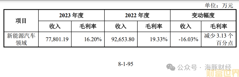 从营收来源看,新能源汽车领域的营收2023年同比减少16.03%,毛利率减少3.13%,降幅较大。在招股书中,鹰峰电子解释称,2023年公司主营业务收入下降主要系向比亚迪销售产品收入降幅较大导致。