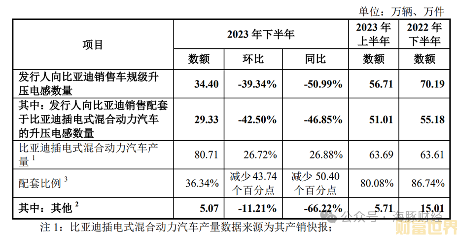 2023年下半年起,比亚迪开始引入新的车规级升压电感供应商,鹰峰电子产品的配套比例降低至36.34%,车规级升压电感销售数量为34.40万件,同比下滑50.99%。