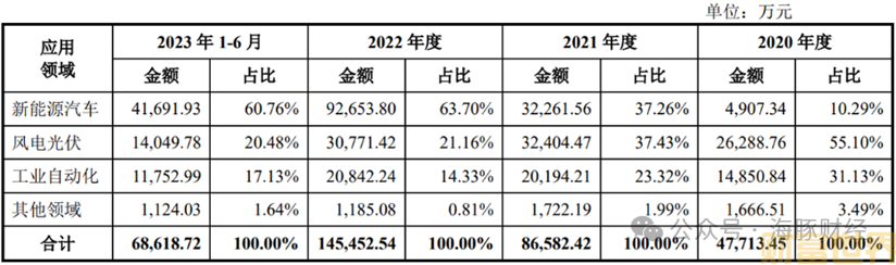 招股书显示,早期鹰峰电子的产品主要应用于风电光伏、工业自动化领域,2020年,鹰峰电子这两大领域的收入占比还高达86.23%。从2021年开始,鹰峰电子经营重心向新能源汽车领域倾斜。