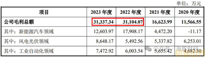 在监管第三轮问询的回复中,鹰峰电子表示,其2023年和2022年的业绩基本持平,毛利额分别为3.11亿元和 3.13亿元,出现了滞涨苗头。其中,新能源汽车领域毛利率从2022年的1.79亿元下跌至1.26亿元,降幅30%;风电光伏领域的增长虽然不错,但该领域的竞争比新能源汽车领域更为激烈,后续可持续性存在疑问。