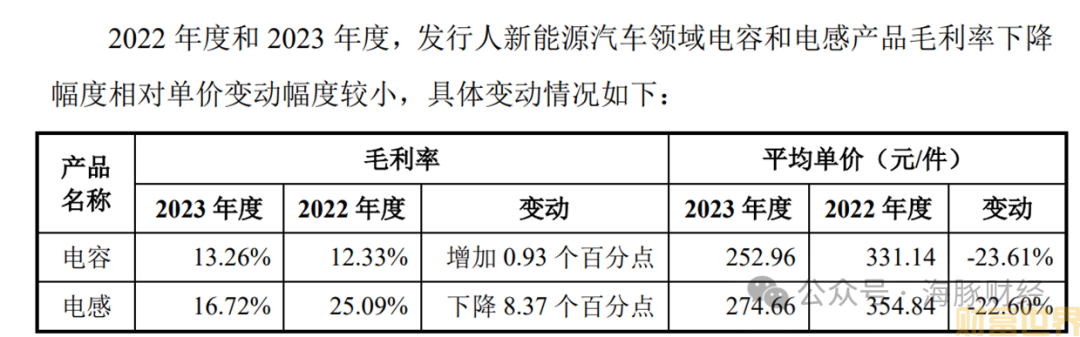 例如,2022年和2023年,鹰峰电子电容产品平均单价下降23.61%,但毛利率不降反升,从12.33%提高至13.26%;电感产品平均单价下跌22.6%,毛利率从25.09%下降至16.72%。