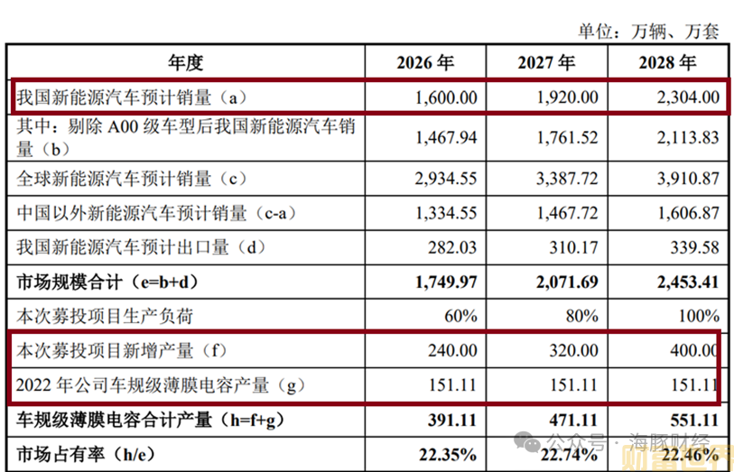 根据上述数据保守计算,过去两年,国内厂商新能源汽车用薄膜电容宣布扩产产能1800万套,加上鹰峰电子计划扩产的600万套,到2026年,国内新能源汽车用薄膜电容产能将高达2400万套;再加上此前已经存在的600万套产能,合计产能将超过3000万套。鹰峰电子在回复函中引用数据显示,2026年我国新能源汽车销量1600万辆,按此计算,届时车规级薄膜电容产能过剩47%;2030年,我国新能源汽车销量2000万辆,车规级薄膜电容产能仍然过剩33%。