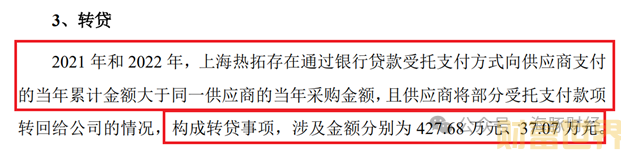 例如,2021年和2022年,鹰峰电子的控股子公司上海热拓电子科技有限公司通过银行贷款受托支付方式向供应商支付的当年累计金额大于同一供应商的当年采购金额,且存在供应商将部分受托支付款项转回给上海热拓的情况,涉及金额分别为427.68万元、37.07万元,构成“转贷”事项。