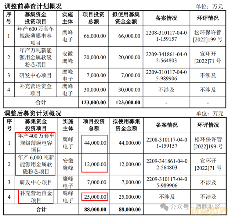海豚财经注意到,鹰峰电子原本计划募资目标为12.3亿元,其中,6.6亿元用于年产600万套车规级薄膜电容项目,2亿元用于年产万吨新能源用金属软磁粉芯项目,7000万元用于研发中心项目,另外3亿元补充营运资金。